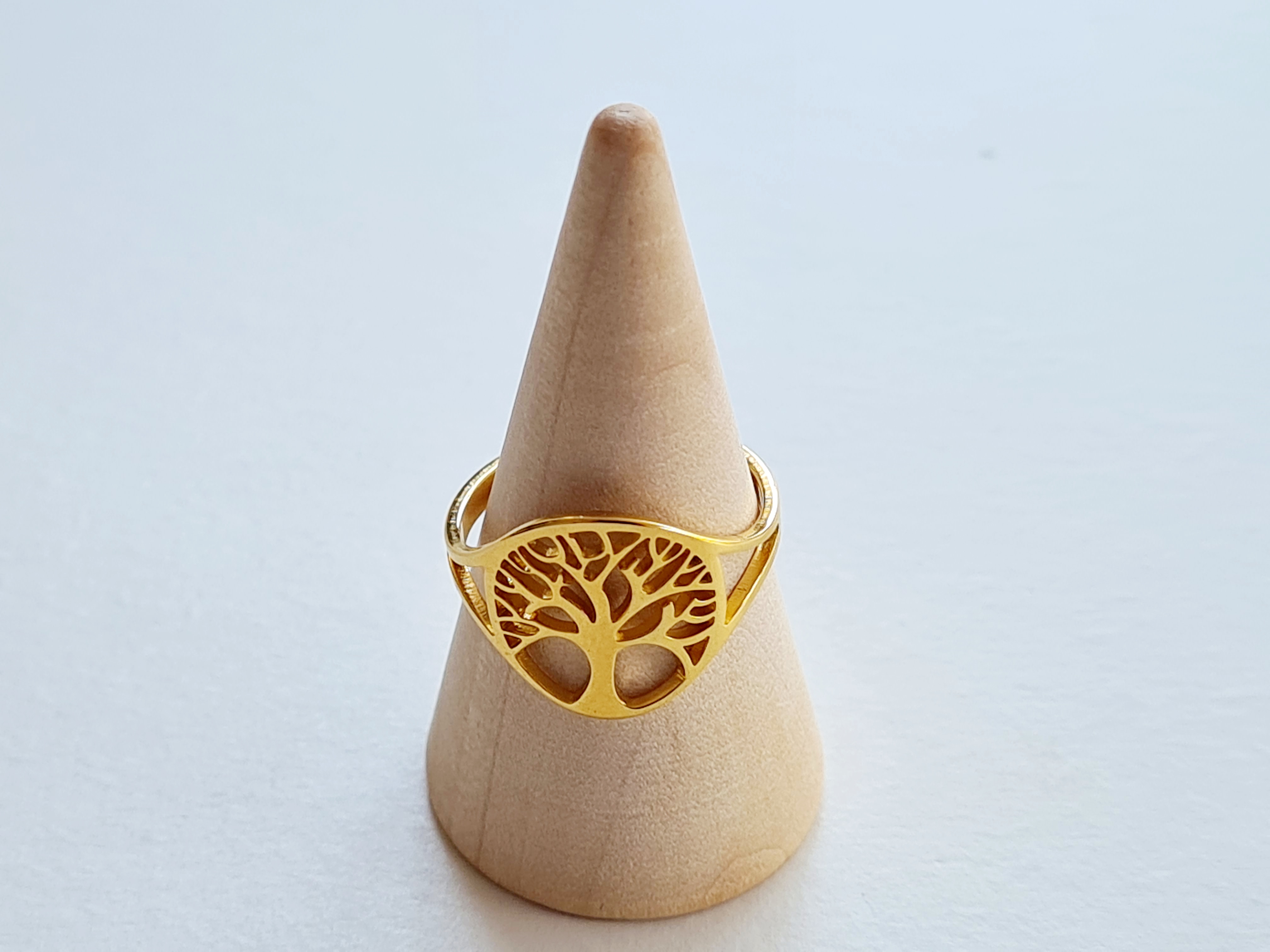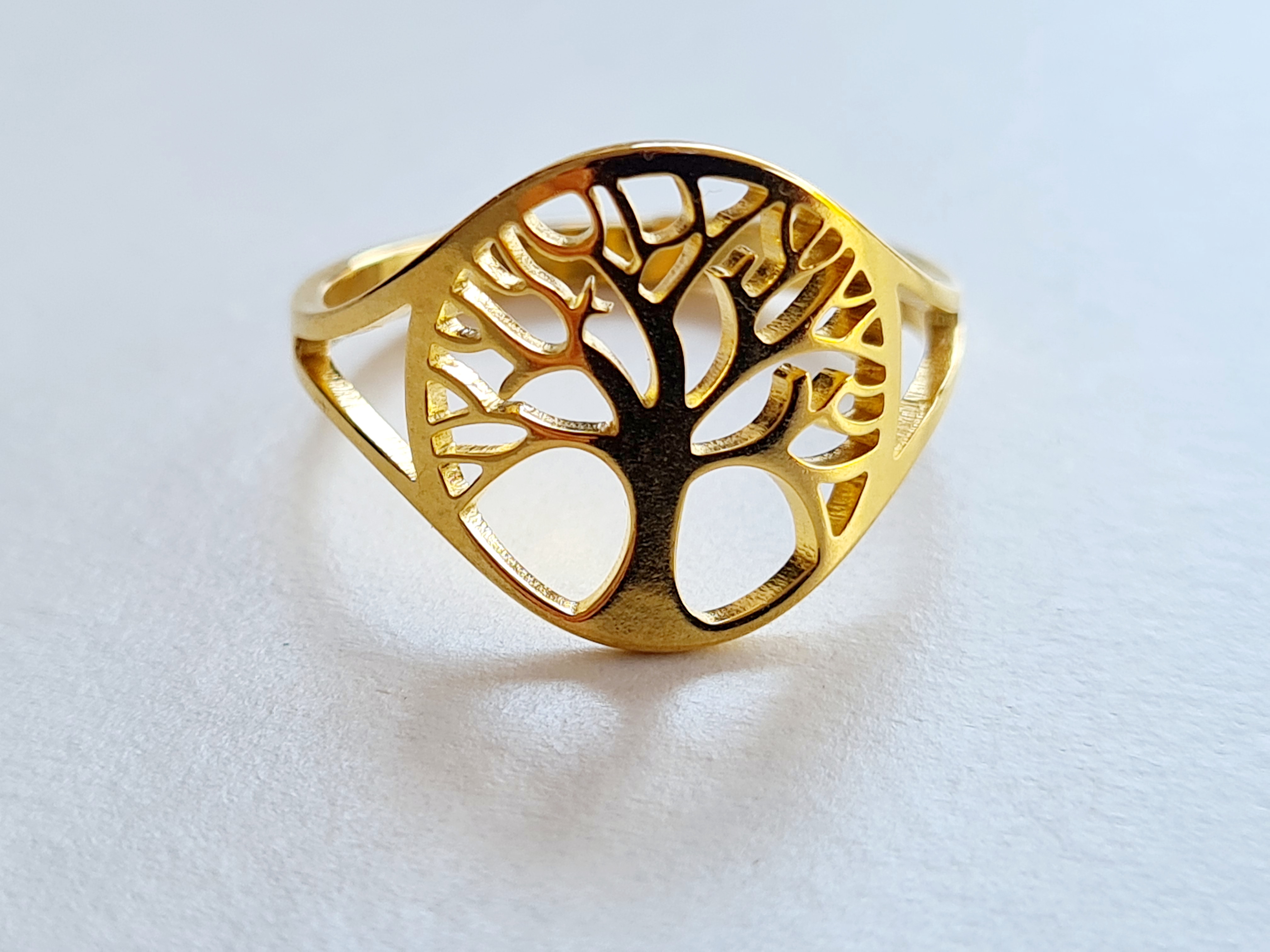 Cette bague en forme d'arbre de vie est en acier inoxydable dorée.