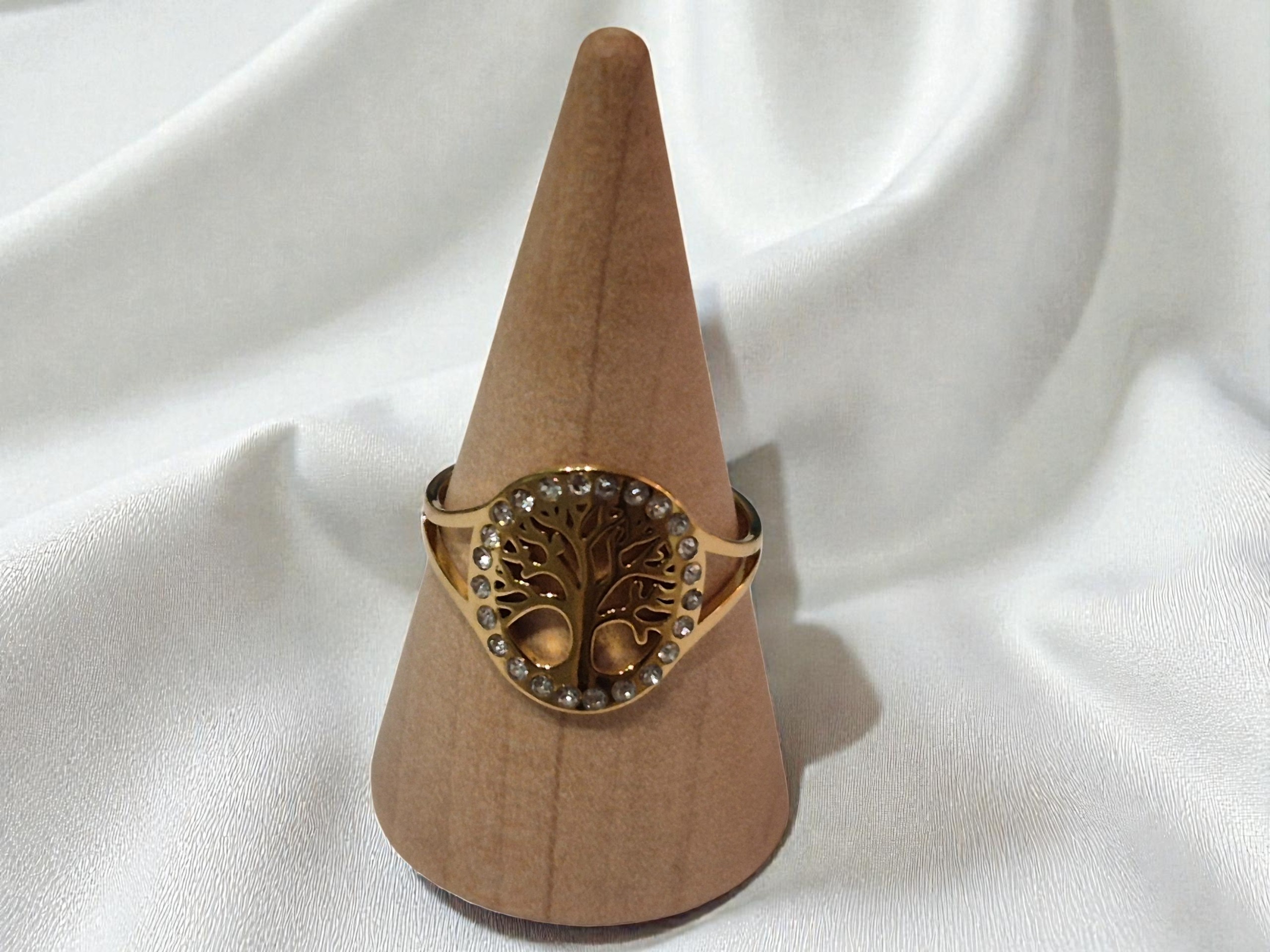 Cette bague en forme d'arbre de vie est en acier inoxydable dorée avec des strass autour.