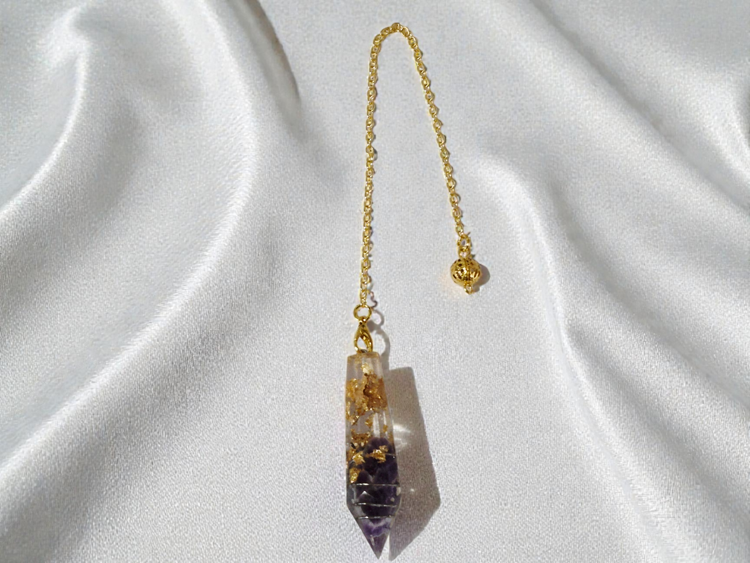 Le pendule orgonite en améthyste mesure environ 5.5 cm. La chainette mesure 17 cm.