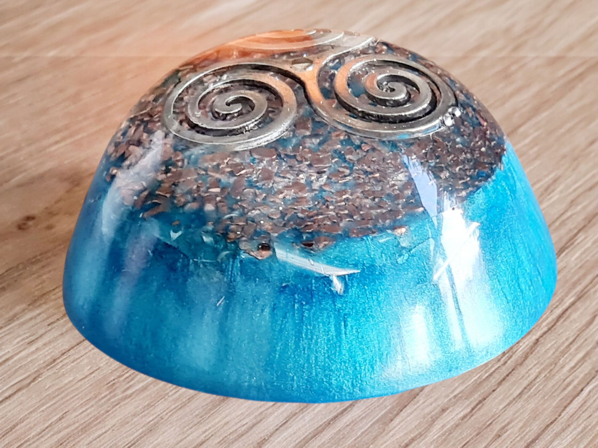Cette orgonite dôme est entièrement fabriquée à la main, de façon artisanale. Même si chaque orgonite se ressemble, elles sont uniques.
