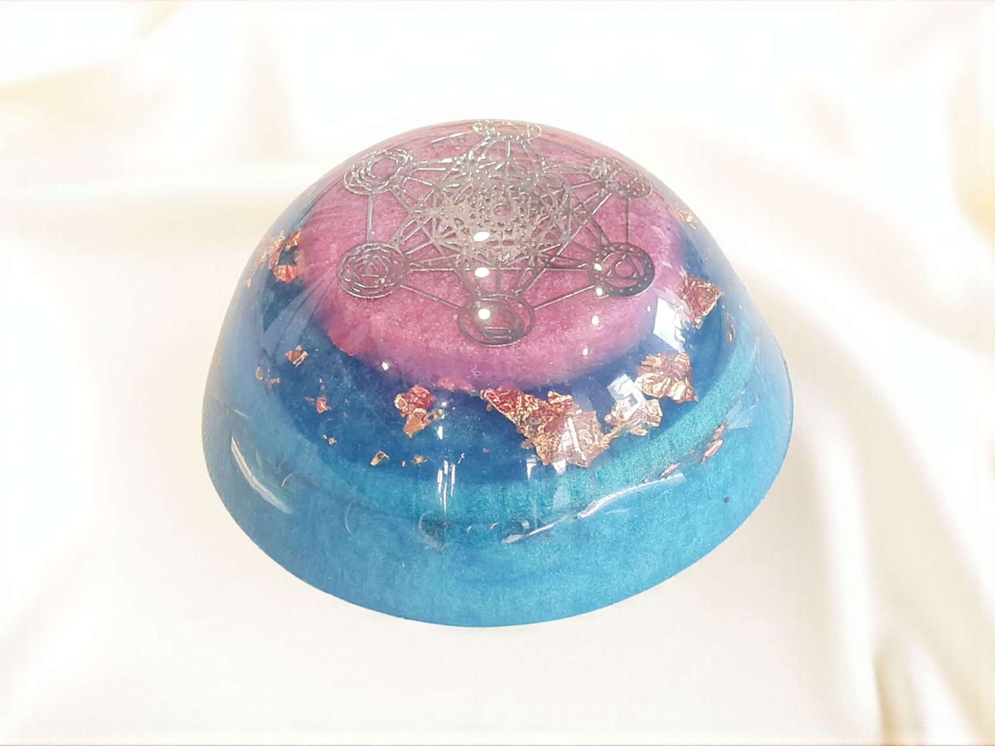 Les Orgonites sont un assemblage de pierres semi-précieuses (quartz rose, cristal de roche, améthyste et tourmaline), de résine époxy et de particules de métal (cuivre, bronze, aluminium et feuille d'or), ainsi que d'une forme de géométrie sacrée, ici le cube de metatron.