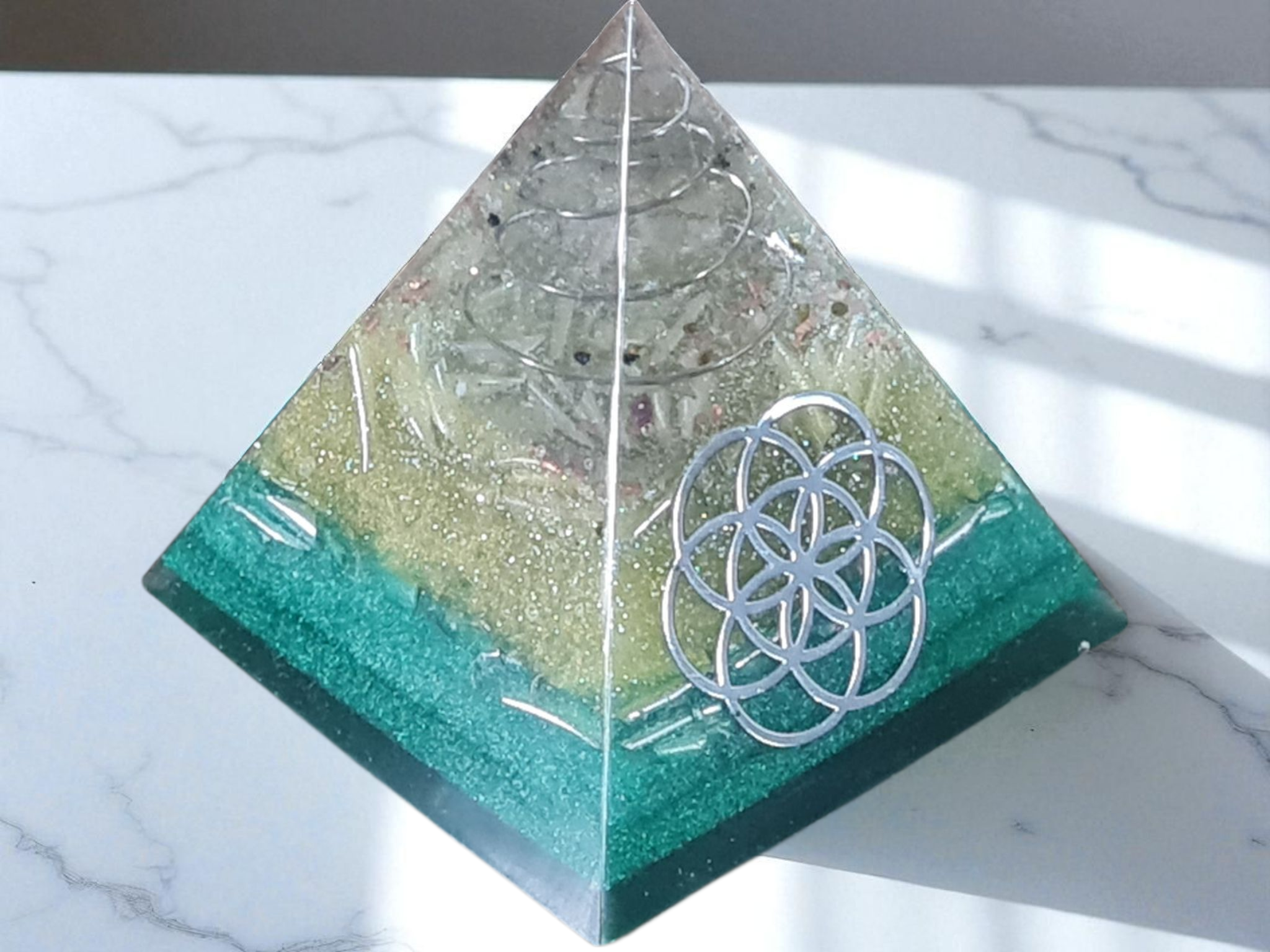 Orgonite pyramide couleur jaune vert hauteur 6cm graine de vie