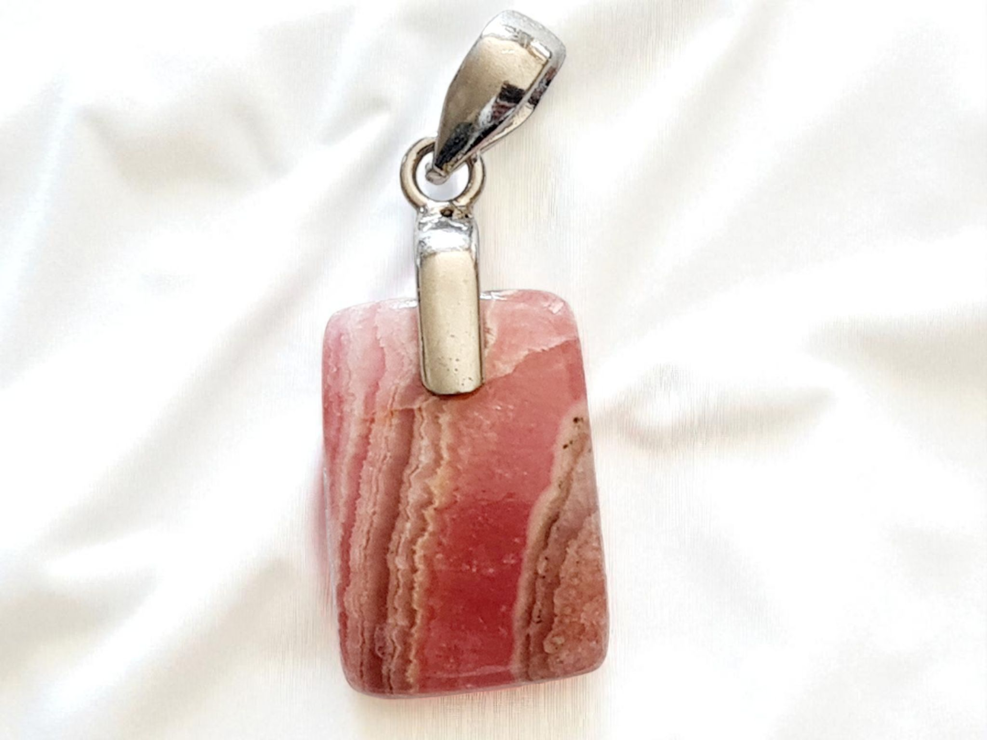 Ce pendentif est en pierre naturelle de rhodochrosite. Son attache est en argent.